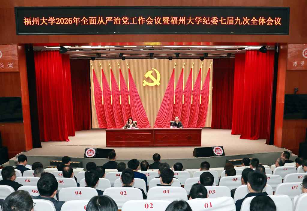 融媒中心讯/3月18日下午,福州大学2026年全面从严治党工作会议暨中共福州大学第七届纪律检查委员会第九次全体会议在图书馆博学厅召开。校领导吴明红、杨黄浩、王心晨、郑煦林、张亚雷、江莉龙、邱挺、卢孝强出席会议。会议由校纪委书记、监察专员郑煦林主持。